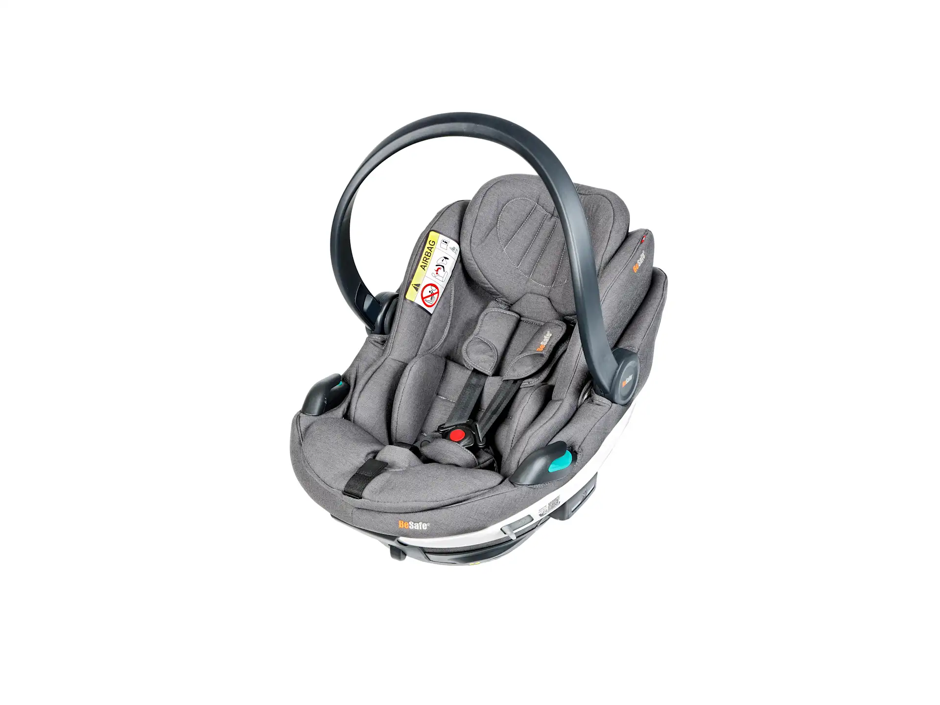 - Cadeira auto segura para bebés, fixada com o cinto de três pontos do veículo.
